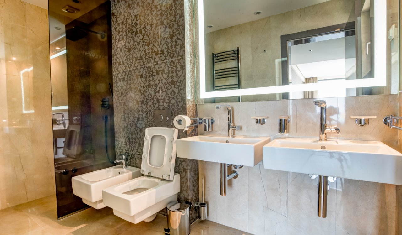 On the 1st floor there are three rooms separated by a wardrobe and a mini bar. Each room has its own terrace, bathroom and wardrobe. The rooms are connected by a hallway to the covered terrace with a whirlpool bath tub.