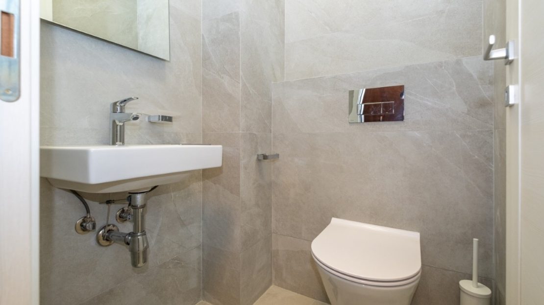 Structure: living room with kitchen and dining area, two bedrooms, bathroom, guest toilet, and a terrace.