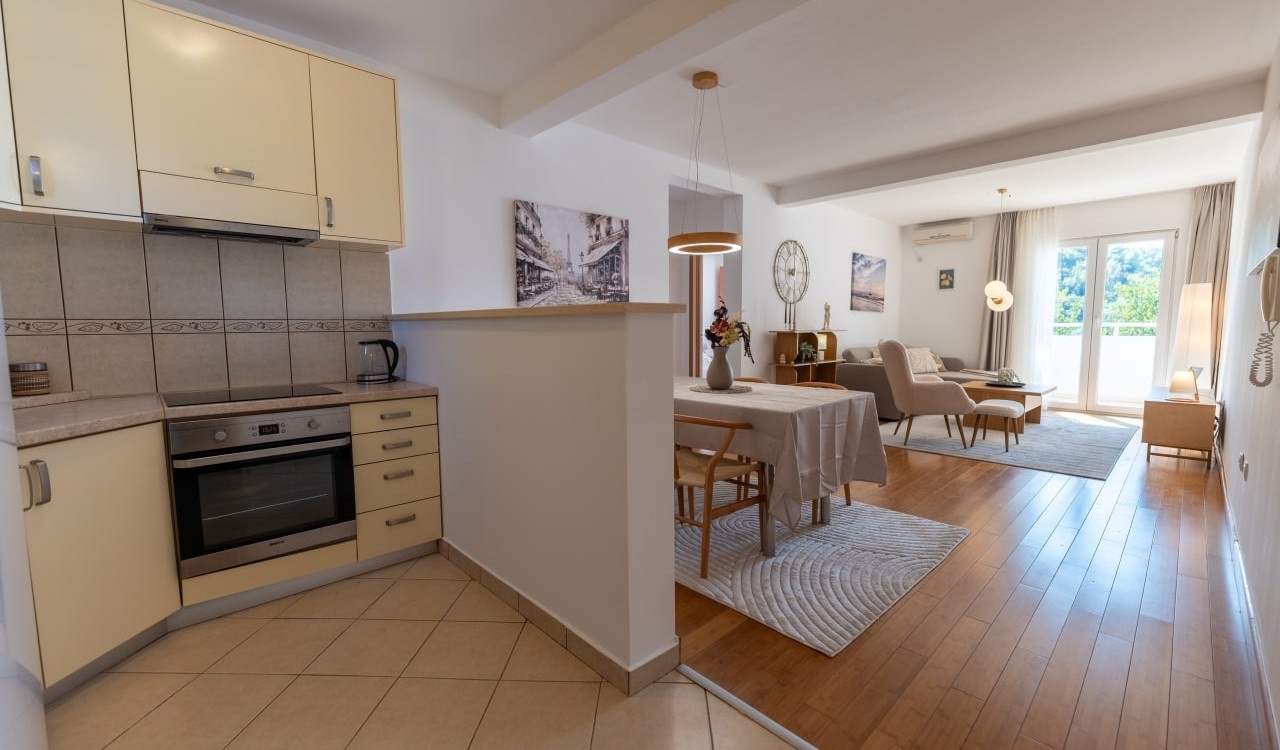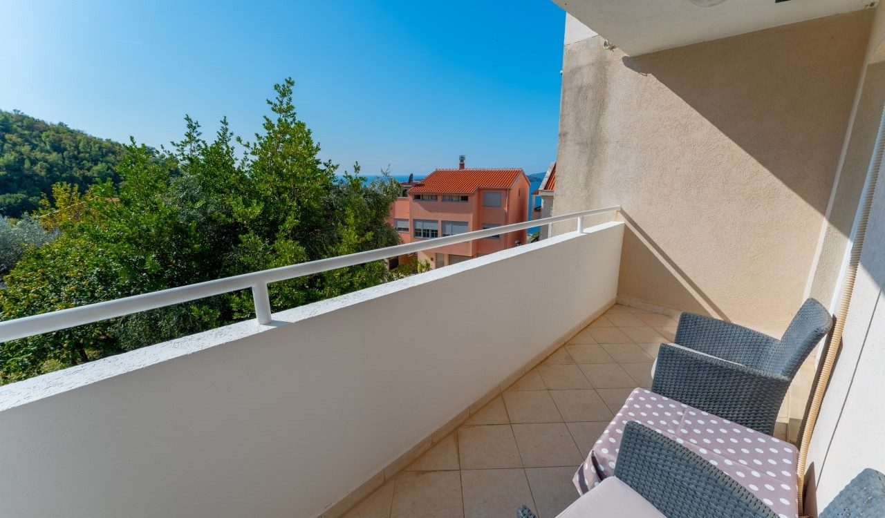 Struktura: dnevni boravak sa kuhinjom, dvije spavaće sobe, kupatilo, prostrana terasa sa pogledom na more, planine i okolinu.