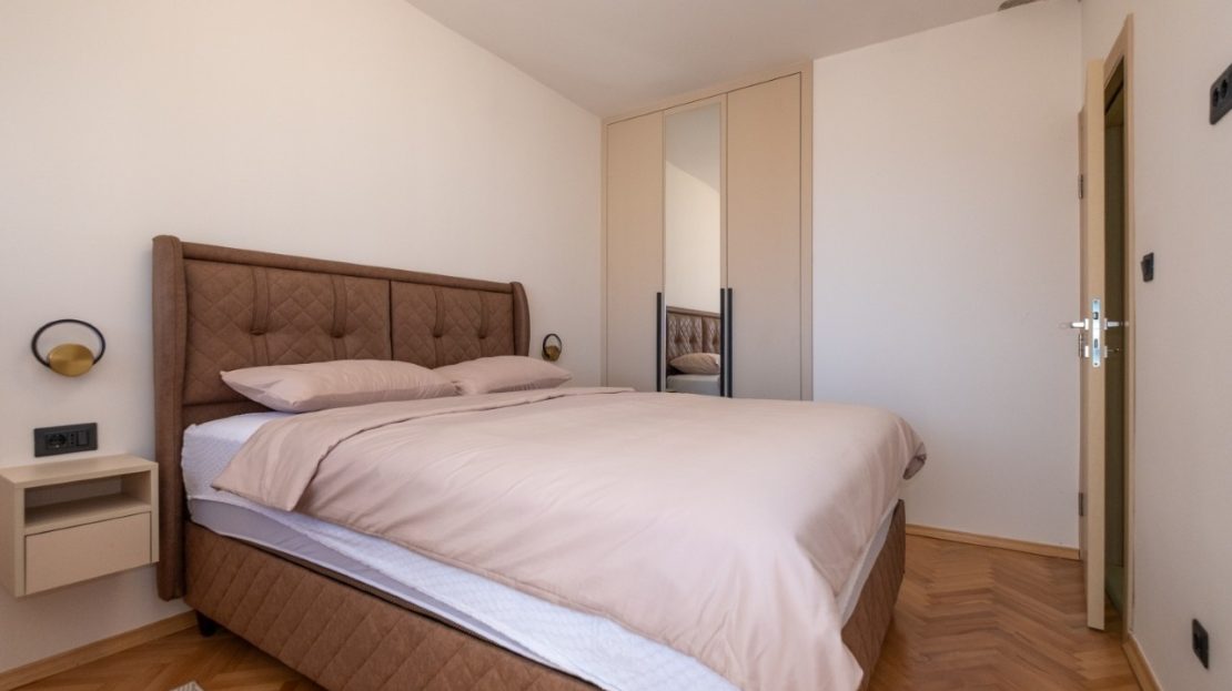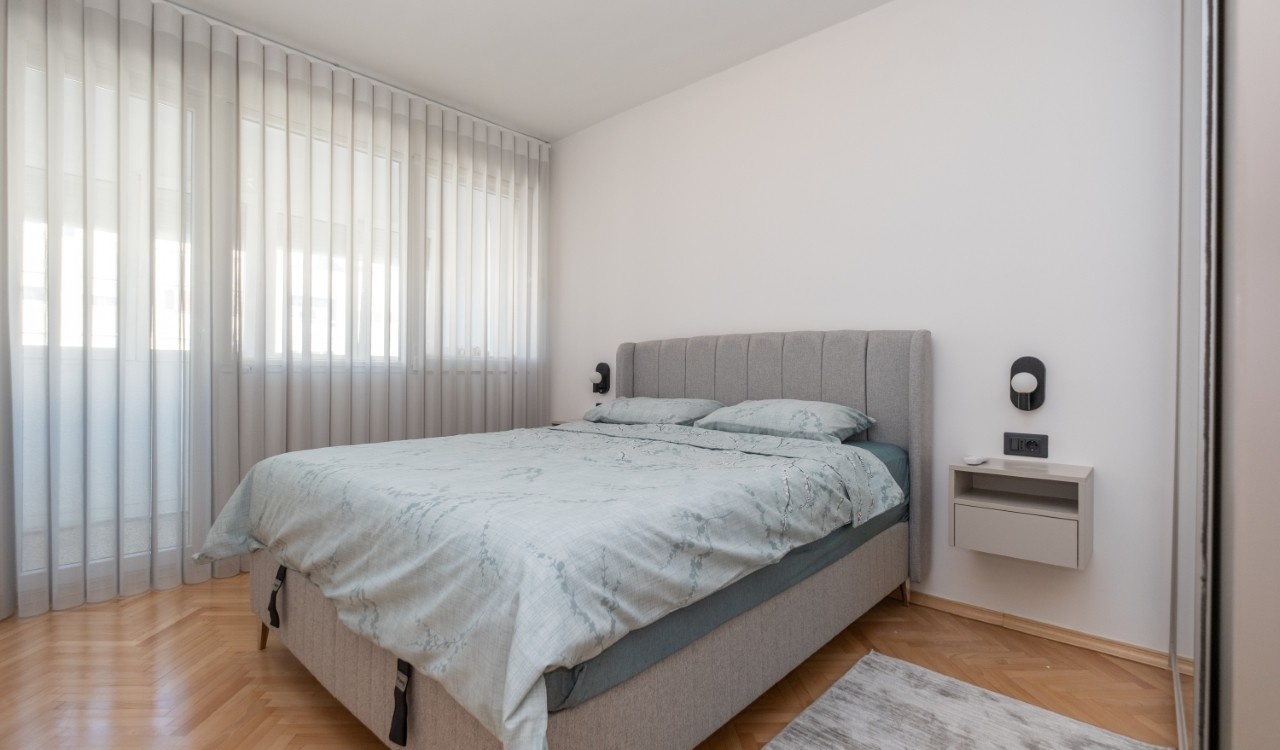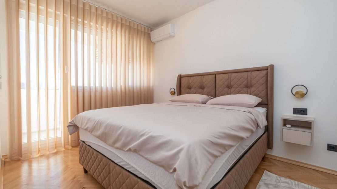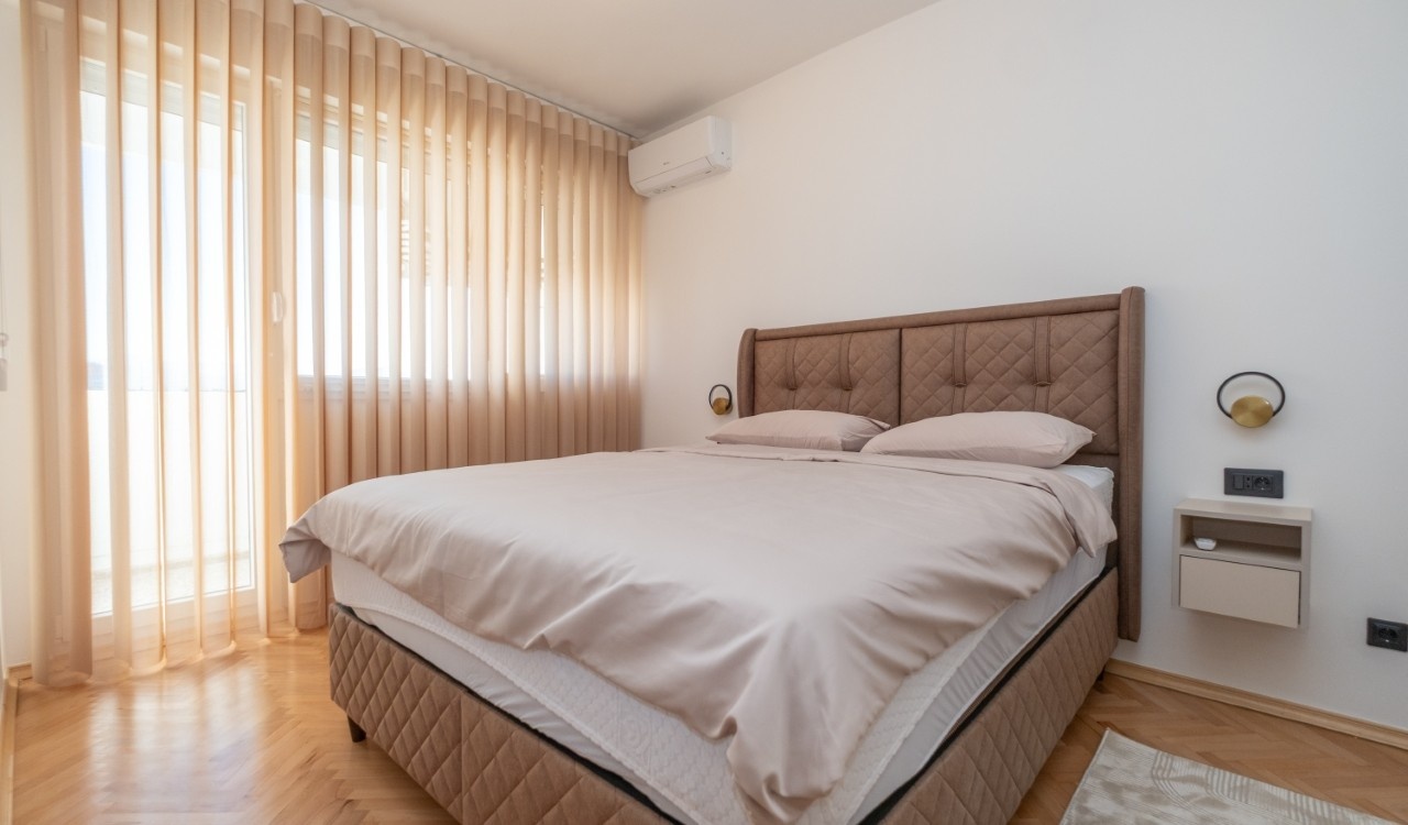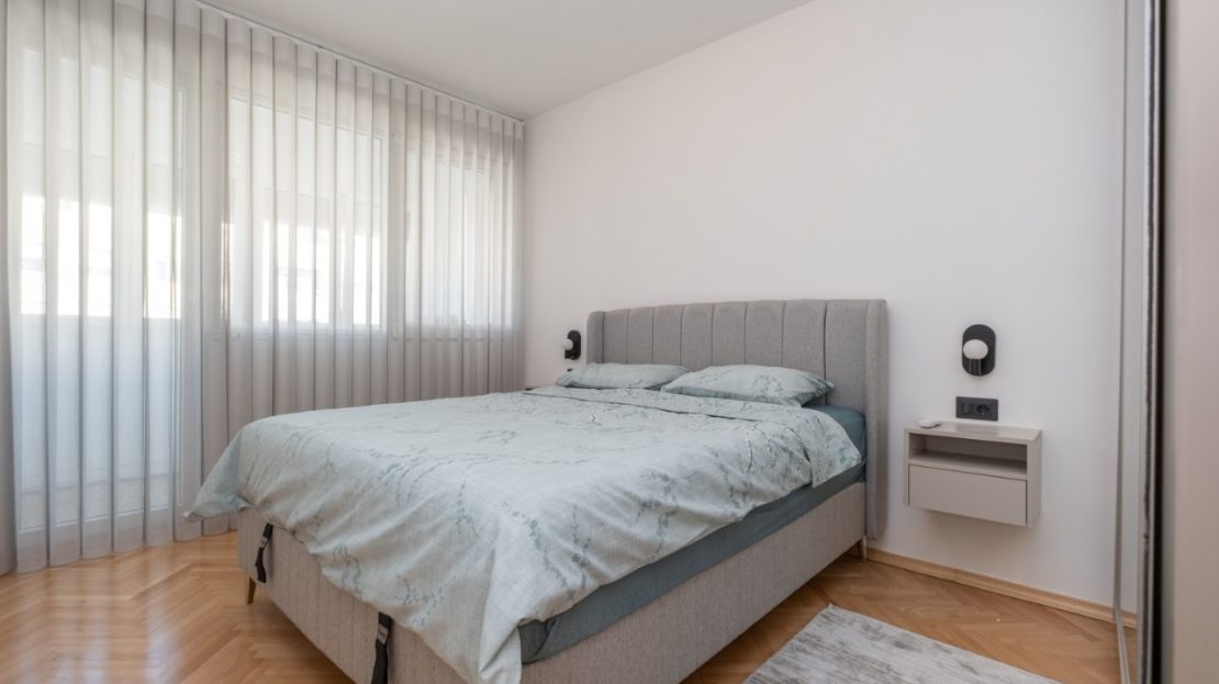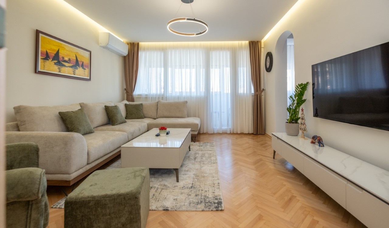 Izdaje se kompletno renoviran i moderno opremljen trosoban stan ukupne površine 101 m², smješten u atraktivnom dijelu grada Preko Morače, u Podgorica, na 5. spratu stambene zgrade sa liftom.