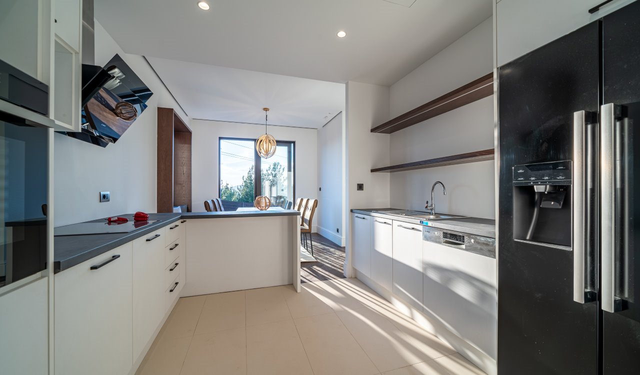 Do prizemlja se nalazi stubište sa metalnom / staklenom ogradom i LED rasvjetom, koja stvara poseban vizualni doživljaj. Kad se uđe na prizemlje, postoji tehnička prostorija za kontrolu CCTV kamere, kao i druge tehničke kontrolne tačke. Ulazak u veliki otvoreni prostor s dnevnim boravkom s desne strane i trpezarijom i kuhinjom s lijeve strane. U dnevnom dijelu dominira kombinacija tradicionalnih i modernih karakteristika, poput drvenih greda i venecijanskog gipsa. Trpezarija se sastoji od velikog stola za 6 osoba koji vodi do potpuno opremljene kuhinje s Bosch uređajima. Kuhinja ima pomoćnu prostoriju sa stražnje strane.