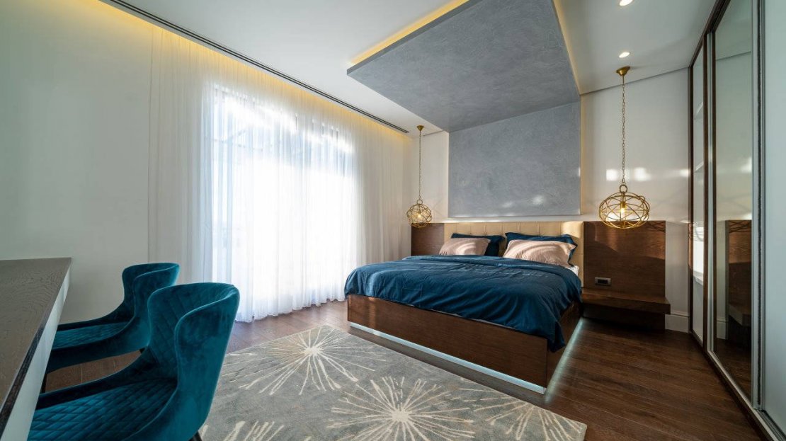 Nakon hodnika, sljedeća na redu je glavna spavaća soba, velika soba od 20m² sa namještajem po mjeri, koji se sastoji od velikog ormara od poda do plafona, kreveta i noćnog stočića. Iz sobe se izlazi na balkon, sa koga se pruža zadivljujući pogled na Bokokotorski zaliv.