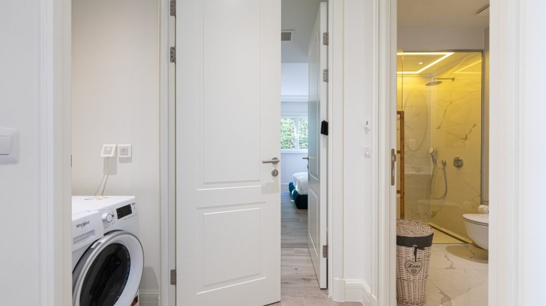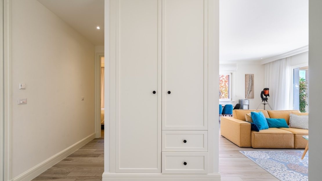 Stanovi su fizički odvojeni, ali povezani zajedničkim hodnikom, što omogućava različite opcije korišćenja – kao dvije samostalne jedinice ili kao jedan veći luksuzni stan na moru.
