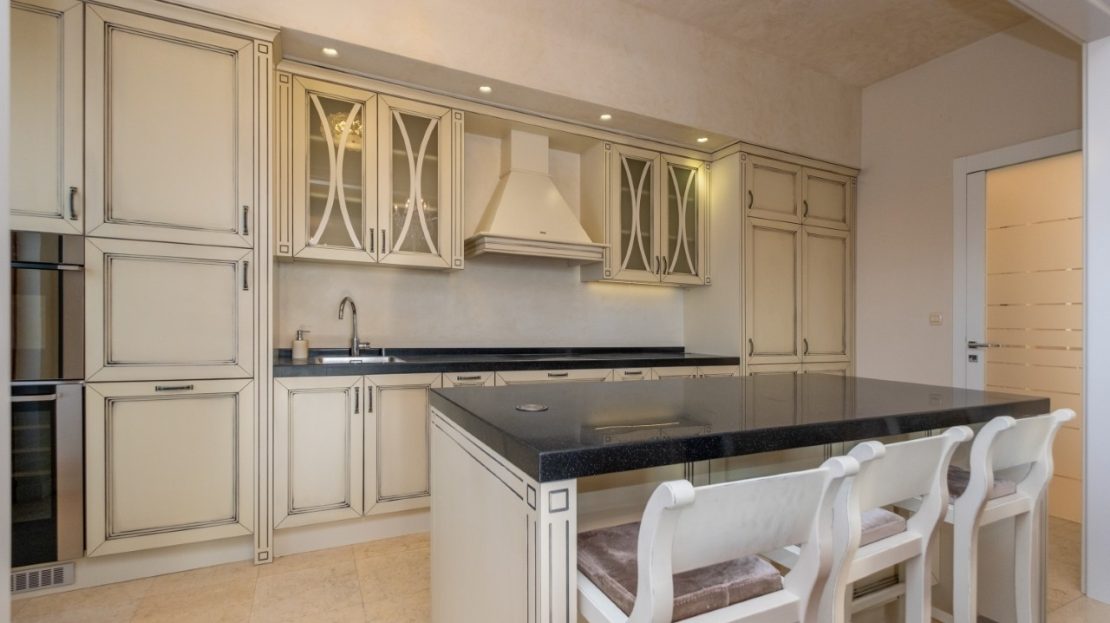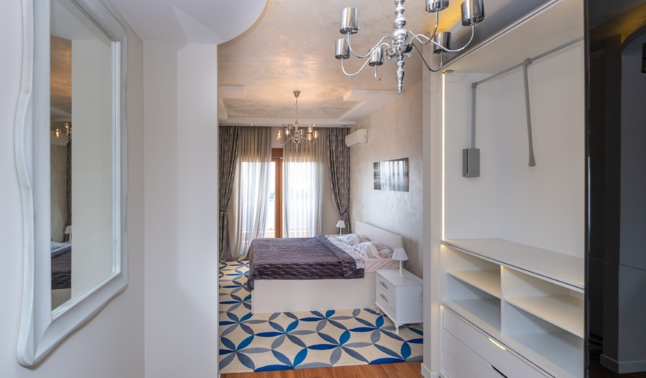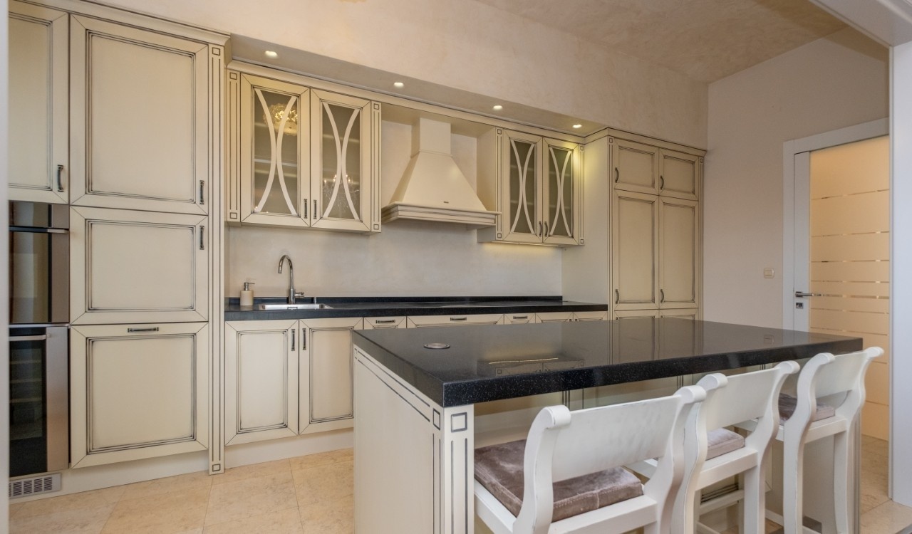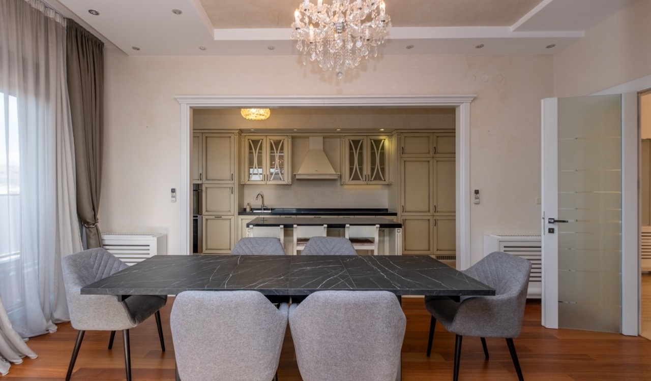 Enterijer je pažljivo dizajniran, sa naglaskom na komfor, funkcionalnost i eleganciju. Dnevni boravak, trpezarija i kuhinja čine otvorenu cjelinu ispunjenu prirodnim svjetlom zahvaljujući staklenim portalima od poda do plafona. Kuhinja je kompletno opremljena aparatima vrhunskog kvaliteta.
