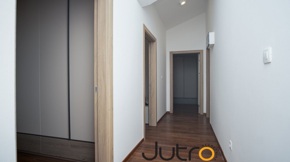 Ovaj dvoiposoban duplex stan površine 89m² nalazi se na devetom spratu u zgradi koja posjeduje dva lifta, smještenoj u naselju Master Kvart.