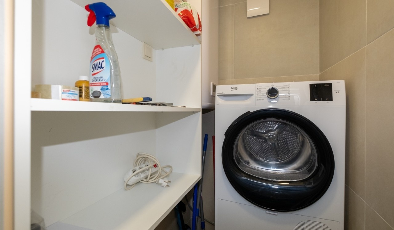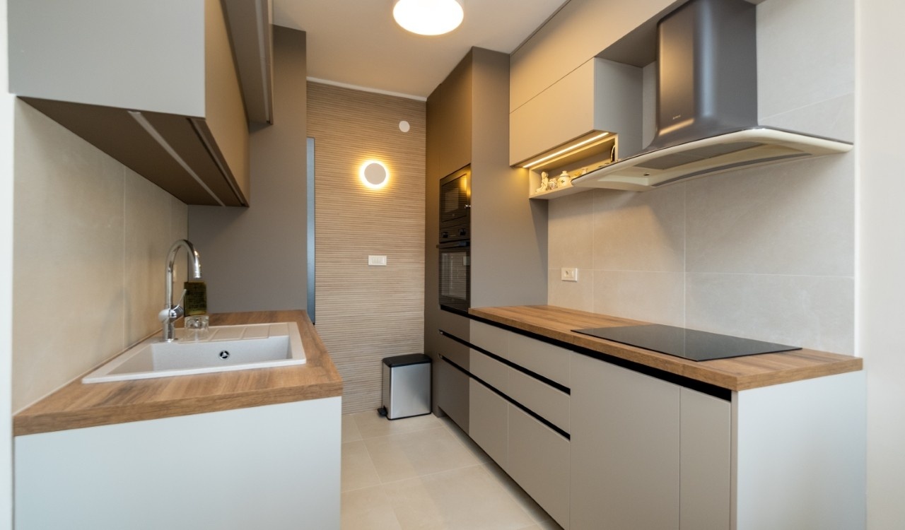 Struktura: ulazni hodnik, dnevni boravak, odvojena kuhinja i trpezarija, dvije spavaće sobe, dva kupatila, dvije terase.