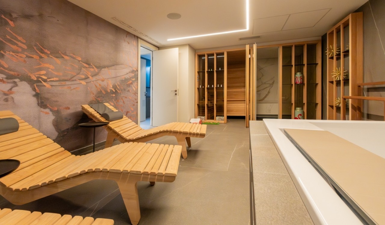- Suteren je dizajniran za udobnost i relaksaciju. Vešeraj je opremljen mašinama za pranje i sušenje veša, kao i mašinom za sudove i ledomatom. Poseban segment zauzimaju SPA i rekreativni sadržaji – sauna, slana soba, đakuzi i potpuno opremljena teretana. Tu su i dodatno kupatilo, rack ormar i prostrana garaža.
